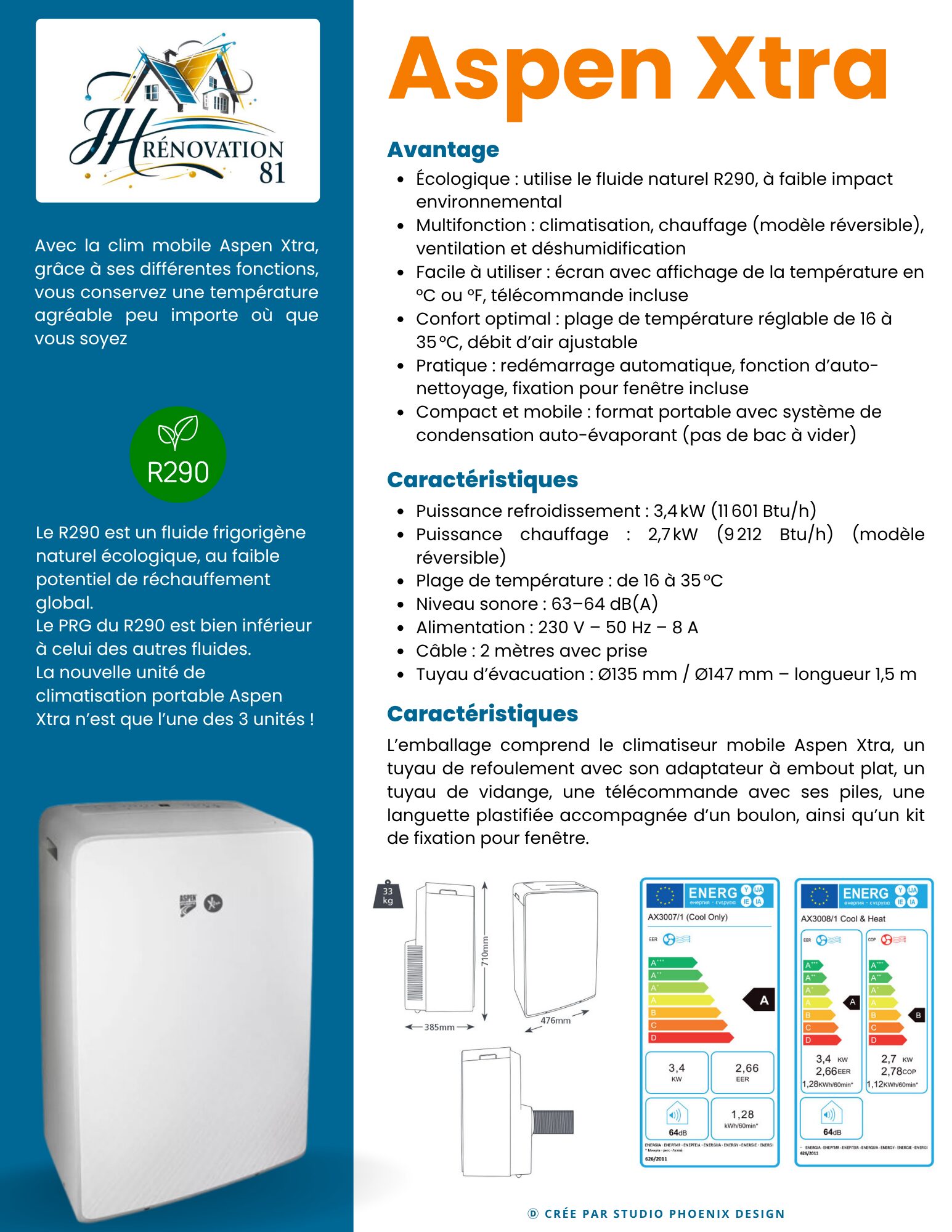 Dans le cadre d’une collaboration avec l’entreprise JH Rénovation 81, j’ai eu le plaisir de concevoir une fiche produit complète pour leur climatiseur mobile Aspen Xtra. Cette réalisation visait à mettre en valeur un appareil multifonction moderne, alliant performance, écologie et confort, tout en respectant l’identité visuelle de la marque.