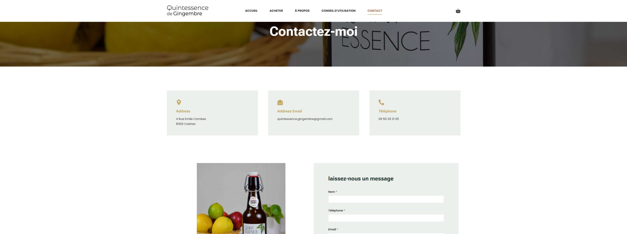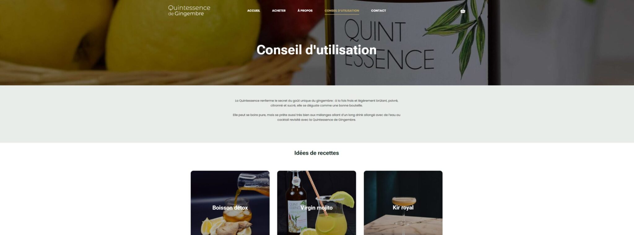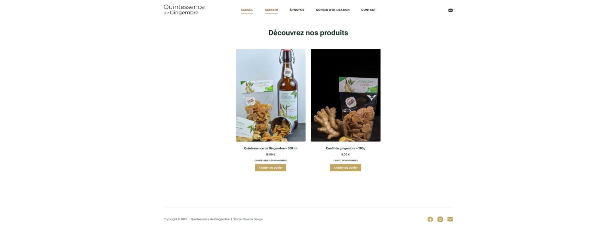 Dans la nouvelle version que j’ai réalisée, l’accent a été mis sur un design plus épuré et cohérent, une navigation simplifiée et un parcours d’achat optimisé. Le site est désormais responsive et plus rapide, avec des fiches produits enrichies et un storytelling renforcé pour mieux valoriser les produits. Cette refonte permet à Quintessence Gingembre de proposer une expérience plus moderne et plus engageante pour ses clients.